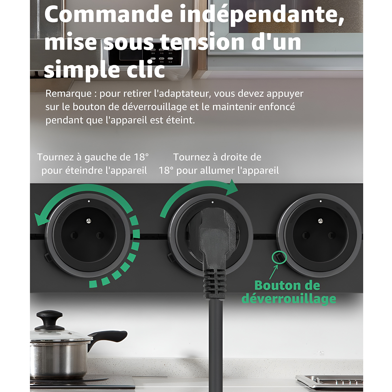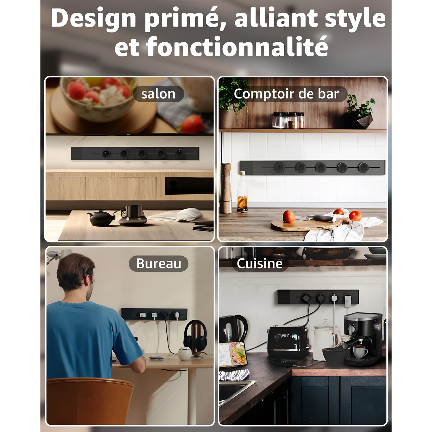 Installation acile : La GONEO multiprise murale cuisine ne mesure que 86 mm de haut et 19 mm d’épaisseur, couvrant parfaitement les ouvertures de prises murales existantes sans qu’il soit nécessaire de creuser des rainures ou de refaire le câblage. Sa hauteur de montage réglable et son canal de câblage intérieur spacieux vous permettent de personnaliser l’emplacement et de ranger soigneusement les câbles. Fixée fermement au mur à l’aide de vis, la GONEO prise electrique murale transforme les cuisines, les salons, les bureaux en environnements sans encombrement en quelques secondes.