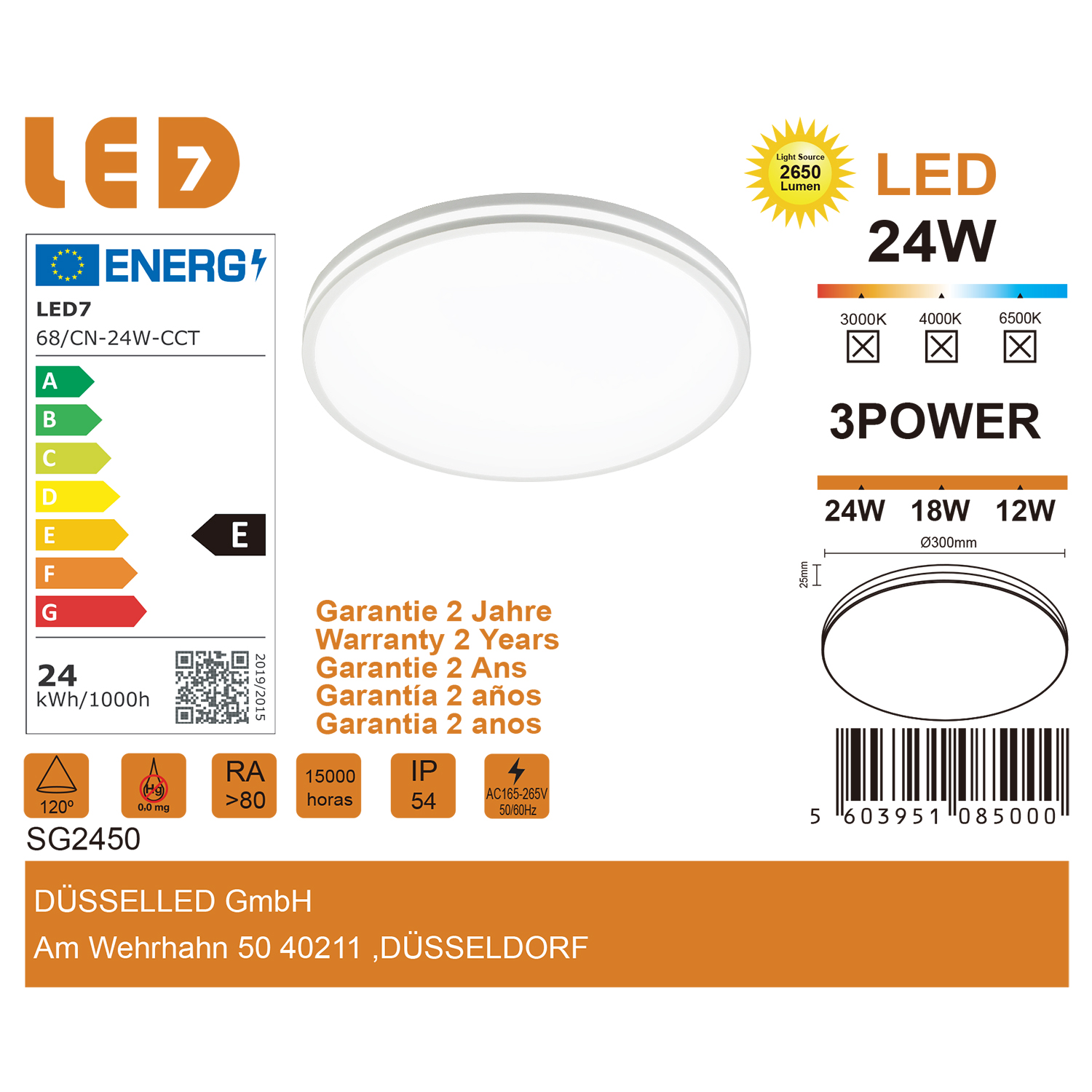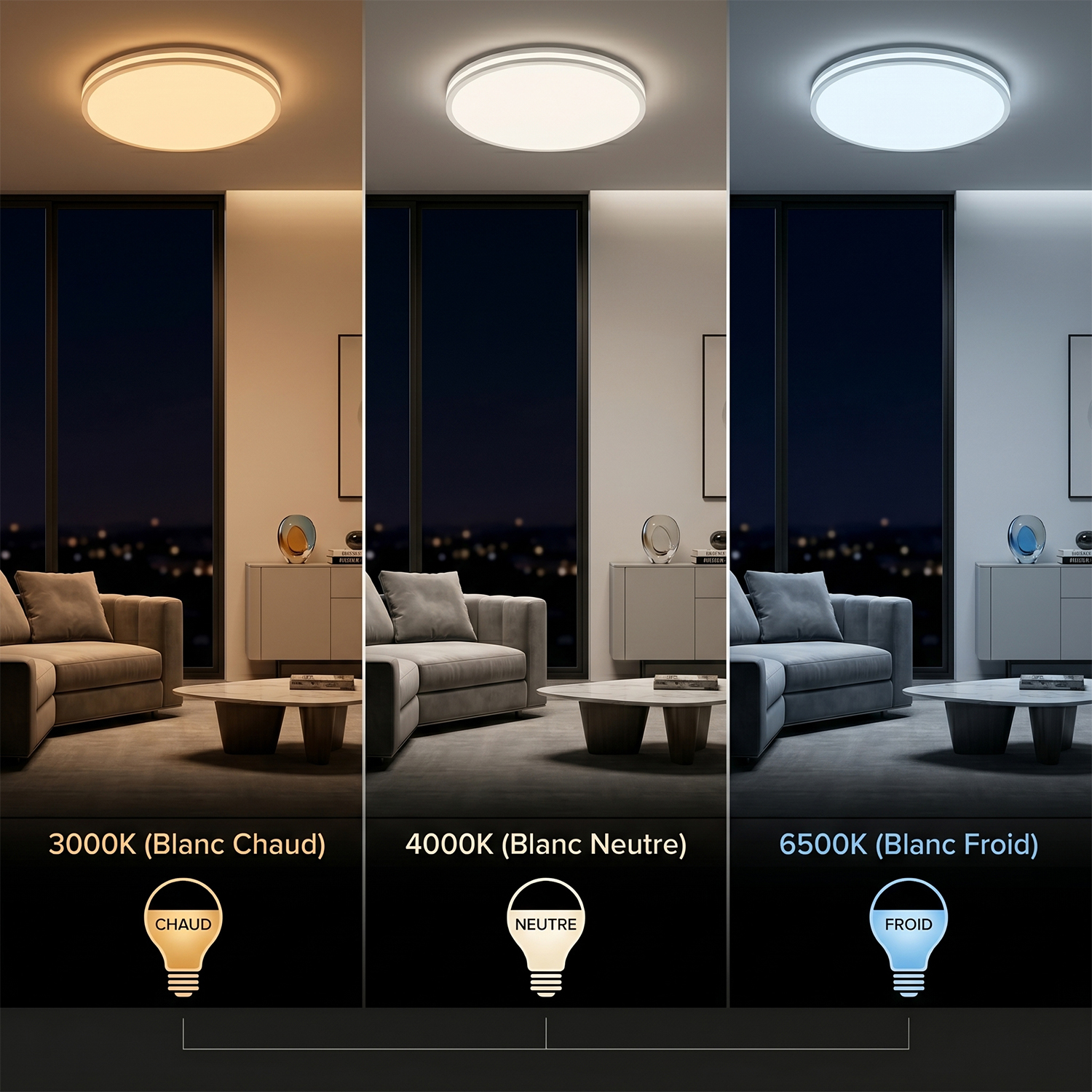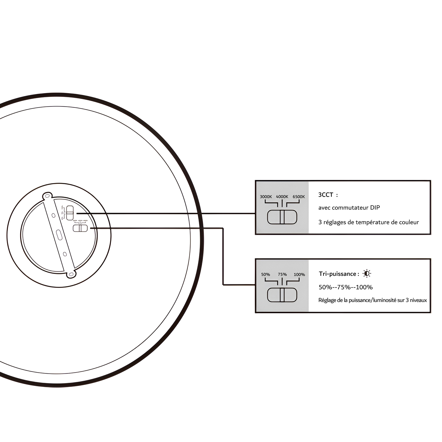 Économique et respectueux des yeux : Puissance sélectionnable : 24 W / 18 W / 12 W pour un fonctionnement efficient. Sans papillotement (flicker-free), il réduit la fatigue visuelle et assure un éclairage doux et continu.