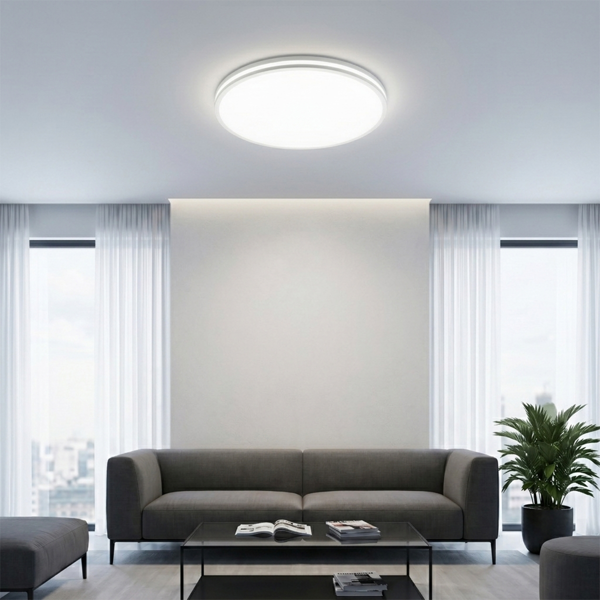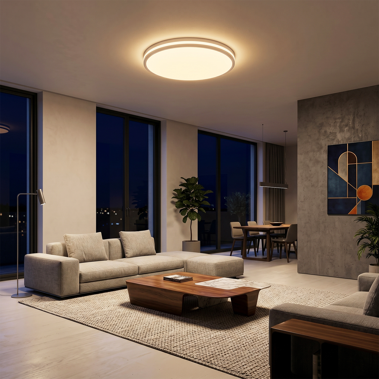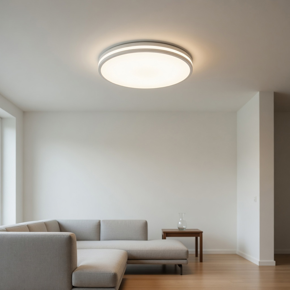 Double éclairage périphérique : Grâce à la technologie d’éclairage circulaire, le double anneau lumineux élimine les zones d’ombre au plafond. Avec un indice de rendu des couleurs (IRC > 80), ce plafonnier LED offre une durée de vie supérieure à celle des ampoules classiques. Les modèles haute puissance éclairent facilement des espaces de plus de 20 m².