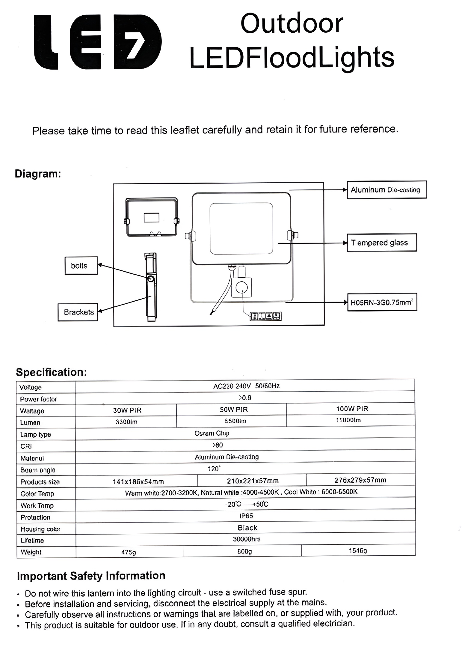 Projecteur LED avec détecteur de mouvement IP65 30W/50W/100W 3K/6K
