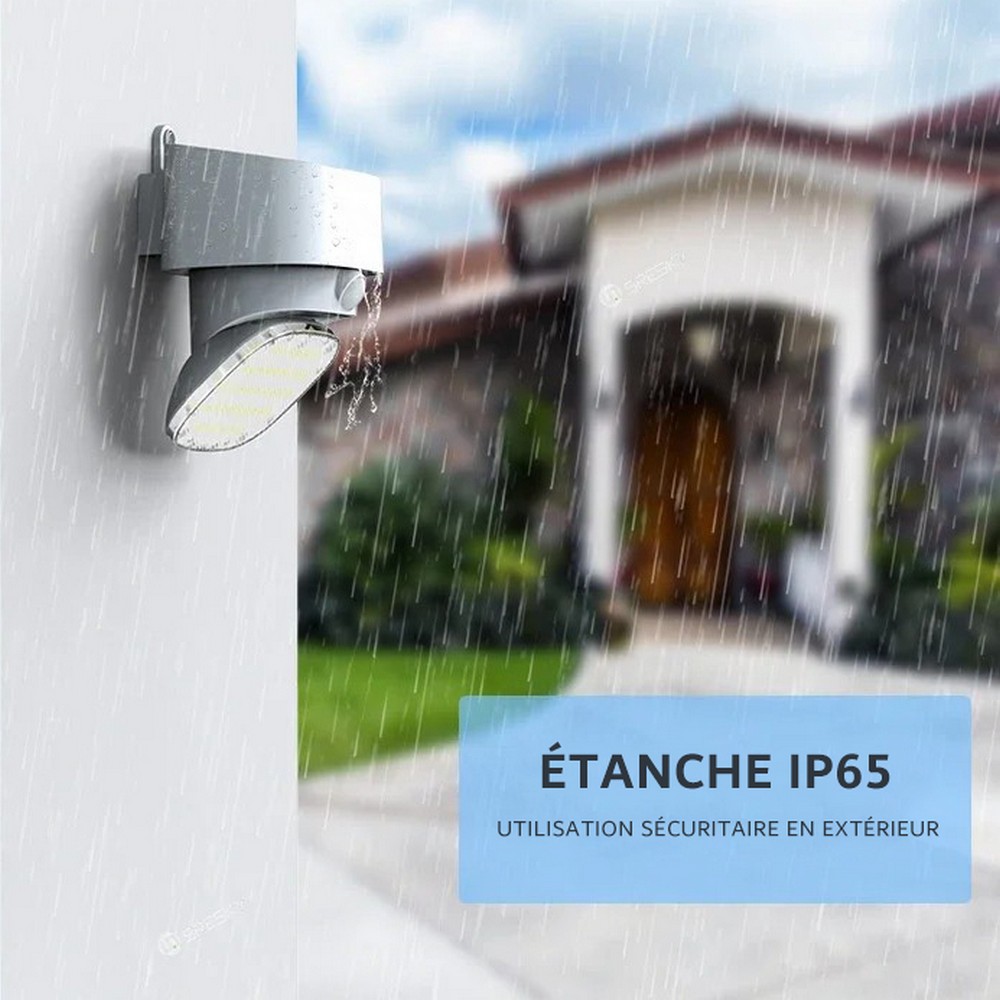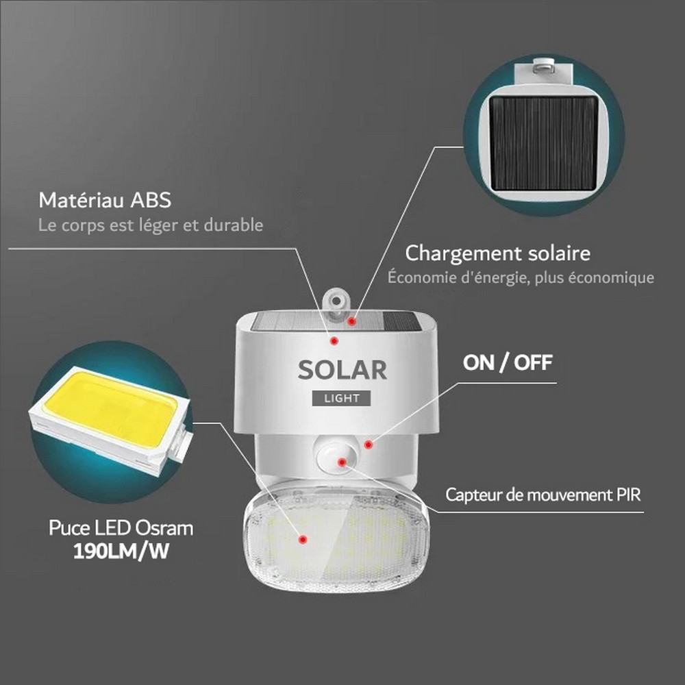 Lampe solaire exterieur super lumineuses 2000LM : Lumiere solaire exterieur appliques d’extérieur à induction solaire ont 39 puce LED, qui fournissent un excellent éclairage allant jusqu’à 2000 lumens. Équipées d’un détecteur de température corporelle tournant avec précision, elles peuvent immédiatement éclairer une zone et maintenir une luminosité plus longue, Une forte émission de lumière éclaire le chemin du retour. Aucun fil n’est nécessaire, aucune alimentation électrique n’est nécessaire.