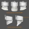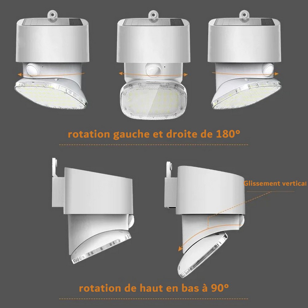 Angles verticaux et horizontaux réglables : Comparé à la plupart des projecteur led exterieur detecteur de mouvement similaires sur le marché, ce lampe solaire exterieur est équipée d’une lampe à capteur avec un angle de déplacement de 120 degrés, ce qui permet d’obtenir un éclairage plus lumineux, plus long et à angle plus large. Convient pour une utilisation extérieure avec les balcons, terrasses, escaliers, jardins, murs extérieurs, cour, chemin, portes d’entrée, garages, porches d’entrée, et pelouses, clôtures, etc.